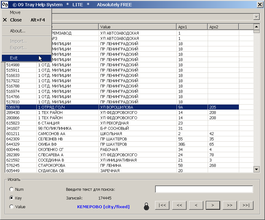 Думаю, что все еще может быть интересна как пример (vector based) InMemory DB. В поставке база телефонов Кемерово 2005. Использован пакер by Chuck Guzis * Dr. Dobb's Journal. #207 November 1993 https://github.com/gazlan/Phonebook Система словарей 09 Tray Help System представляет из себя миниатюрную In-Memory Database вызываемую как POP-UP справка. Непрактично, хотя и возможно, хранить в 09 Tray Help System, например, Большой Энциклопедический Словарь (БЭС). Типичное применение 09 - это хранение небольших (до нескольких десятков тысяч) и редко обновляемых списков. Например, телефоны организации, толковые или двуязычные мини-словари, всевозможные расписания и прейскуранты, таблица неправильных глаголов, интернет-пароли, списки памятных дат (религиозных праздников), сборники афоризмов итп.