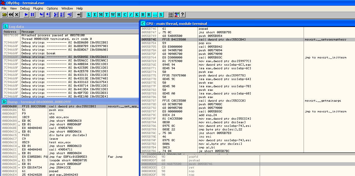 Программного решения нет. Пока что свёртка возможна в ручном режиме, если известно, что искать. В данном случае программа слинкована с библиотеками mfc и mvcrt. OEP из образа MetaEditor.exe : 0044BDB6 >/$ 55 PUSH EBP 0044BDB7 |. 8BEC MOV EBP,ESP 0044BDB9 |. 6A FF PUSH -1 0044BDBB |. 68 80734500 PUSH MetaEdit.00457380 0044BDC0 |. 68 3CBF4400 PUSH <JMP.&MSVCRT._except_handler3> ; Ввод адреса; Установка дескриптора SE 0044BDC5 |. 64:A1 0000000>MOV EAX,DWORD PTR FS:[0] 0044BDCB |. 50 PUSH EAX 0044BDCC |. 64:8925 00000>MOV DWORD PTR FS:[0],ESP 0044BDD3 |. 83EC 68 SUB ESP,68 0044BDD6 |. 53 PUSH EBX 0044BDD7 |. 56 PUSH ESI 0044BDD8 |. 57 PUSH EDI 0044BDD9 |. 8965 E8 MOV DWORD PTR SS:[EBP-18],ESP 0044BDDC |. 33DB XOR EBX,EBX 0044BDDE |. 895D FC MOV DWORD PTR SS:[EBP-4],EBX 0044BDE1 |. 6A 02 PUSH 2 0044BDE3 |. FF15 DCDB4400 CALL DWORD PTR DS:[<&MSVCRT.__set_app_ty>; MSVCRT.__set_app_type 0044BDE9 |. 59 POP ECX 0044BDEA |. 830D 40274600>OR DWORD PTR DS:[462740],FFFFFFFF 0044BDF1 |. 830D 44274600>OR DWORD PTR DS:[462744],FFFFFFFF 0044BDF8 |. FF15 D0DB4400 CALL DWORD PTR DS:[<&MSVCRT.__p__fmode>] ; MSVCRT.__p__fmode 0044BDFE |. 8B0D 24274600 MOV ECX,DWORD PTR DS:[462724] 0044BE04 |. 8908 MOV DWORD PTR DS:[EAX],ECX 0044BE06 |. FF15 D4DB4400 CALL DWORD PTR DS:[<&MSVCRT.__p__commode>; MSVCRT.__p__commode 0044BE0C |. 8B0D 20274600 MOV ECX,DWORD PTR DS:[462720] 0044BE12 |. 8908 MOV DWORD PTR DS:[EAX],ECX 0044BE14 |. A1 D8DB4400 MOV EAX,DWORD PTR DS:[<&MSVCRT._adjust_f> 0044BE19 |. 8B00 MOV EAX,DWORD PTR DS:[EAX] 0044BE1B |. A3 3C274600 MOV DWORD PTR DS:[46273C],EAX 0044BE20 |. E8 16010000 CALL MetaEdit.0044BF3B 0044BE25 |. 391D 70174600 CMP DWORD PTR DS:[461770],EBX 0044BE2B |. 75 0C JNZ SHORT MetaEdit.0044BE39 Код из ложной OEP terminal.exe : 004AE800 55 PUSH EBP ; Real entry point of SFX code 004AE801 8BEC MOV EBP,ESP 004AE803 6A FF PUSH -1 004AE805 68 B2164000 PUSH terminal.004016B2 004AE80A 68 B2164000 PUSH terminal.004016B2 004AE80F 64:A1 00000000 MOV EAX,DWORD PTR FS:[0] 004AE815 50 PUSH EAX 004AE816 64:8925 00000000 MOV DWORD PTR FS:[0],ESP дальше мусор 004AE81D 83C4 10 ADD ESP,10 004AE820 B8 00000000 MOV EAX,0 004AE825 8BE5 MOV ESP,EBP 004AE827 5D POP EBP ... Вначале я трассировал вручную, но через несколько минут понял, что это займет несколько дней. Поэтому я еще раз проанализировал код из Метаедитора. По структуре код должен быть одинаков, но адреса ячеек памяти для хранения переменных и адреса переходов на ПП будут отличаться. Остальные опкоды должны совпадать. Поэтому, находясь в секции 00BDxxxxx я выполнил поиск бинарной строки 83 EC 68 и такая нашлась. Ставлю брйкпоинт и нажимаю F9. Найденные команды я копировал поверх блока из МетаЕдитора. Вызовы вида FF15 D0DB4400 CALL DWORD PTR DS:[<&MSVCRT.__p__fmode>] ; MSVCRT.__p__fmode я искал перед самым их вызовом через поиск Search for... Name in all modules -> Sort by section, двойной щелчок для перехода в код. В итоге получилось следующий код для вставки в OEP терминала: 004AE800 55 PUSH EBP ; Real entry point of SFX code 004AE801 8BEC MOV EBP,ESP 004AE803 6A FF PUSH -1 004AE805 68 B2164000 PUSH terminal.004016B2 004AE80A 68 B2164000 PUSH terminal.004016B2 ; SE handler installation 004AE80F 64:A1 00000000 MOV EAX,DWORD PTR FS:[0] 004AE815 50 PUSH EAX 004AE816 64:8925 00000000 MOV DWORD PTR FS:[0],ESP 00BD02FA 83EC 68 SUB ESP,68 0044BDD6 |. 53 PUSH EBX 0044BDD7 |. 56 PUSH ESI 0044BDD8 |. 57 PUSH EDI 00BD04E3 8965 E8 MOV DWORD PTR SS:[EBP-18],ESP 00BD054B 33DB XOR EBX,EBX 0044BDDE |. 895D FC MOV DWORD PTR SS:[EBP-4],EBX ; код отсутствует, но я оставил 00BD064D 6A 02 PUSH 2 00BD06B0 FF15 B8CC5500 CALL DWORD PTR DS:[55CCB8] ; msvcrt.__set_app_type 00BBD8EC 59 POP ECX 00BD07B9 830D 90975900 FF OR DWORD PTR DS:[599790],FFFFFFFF 00BD0826 830D 94975900 FF OR DWORD PTR DS:[599794],FFFFFFFF 00BD0895 FF15 A8CC5500 CALL DWORD PTR DS:[55CCA8] ; msvcrt.__p__fmode 00BD0903 8B0D 84975900 MOV ECX,DWORD PTR DS:[599784] 00BD096E 8908 MOV DWORD PTR DS:[EAX],ECX 00BD09DB FF15 ACCC5500 CALL DWORD PTR DS:[55CCAC] ; msvcrt.__p__commode 00BD0A7B 8B0D 80975900 MOV ECX,DWORD PTR DS:[599780] 00BD0AE2 8908 MOV DWORD PTR DS:[EAX],ECX 00BD0B49 A1 B0CC5500 MOV EAX,DWORD PTR DS:[55CCB0] ;[<&MSVCRT._adjust_f> 00BD0B8D 8B00 MOV EAX,DWORD PTR DS:[EAX] 0044BE1B |. A3 3C274600 MOV DWORD PTR DS:[46273C],EAX ; код отсутствует, исключен 0044BE20 |. E8 16010000 CALL MetaEdit.0044BF3B ; код отсутствует, исключен 00BD0D67 391D A0A65800 CMP DWORD PTR DS:[58A6A0],EBX { // для справки 0055B747 75 0C JNZ SHORT terminal.0055B755 0055B749 68 54B85500 PUSH terminal.0055B854 0055B74E FF15 B4CC5500 CALL DWORD PTR DS:[55CCB4] ; msvcrt.__setusermatherr } Бинарная строка с адреса 0055B6DC: 558BEC6AFF68B216400068B216400064A100000000506489250000000083EC685356578965E833DB895DFC6A02FF15B8CC550059830D90975900FF830D94975900FFFF15A8CC55008B0D849759008908FF15ACCC55008B0D809759008908A1B0CC55008B00391DA0A65800 --- Сообщение объединено, 9 апр 2019 --- Indy_, есть некоторые соображения, как отсеять мусор. Однотипные операции, которые обычно не встречаются в обычном коде, группа операций не изм