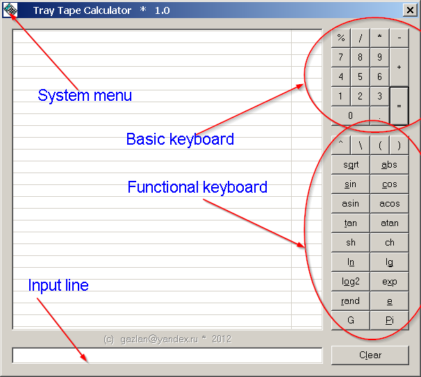 https://github.com/gazlan/TTC TTC - простой однострочный калькулятор, допускающий скобочные выражения и поддерживающий основные математические функции. После запуска TTC постоянно находится в трее, откуда может быть вызван кликом мышки по его иконке. Для выхода из программы необходимо выбрать пункт "Exit" из системного меню. История ввода сохраняется в буфере (последние 128 строк), откуда может быть скопирована по правому клику. Двойной клик по строке истории копирует ее в строку ввода. Полный список поддерживаемых выражений: Операторы: '0'..'9' и '.' - цифры и разделитель дробной части '(', ')' - левая и правая скобки '+', '-' - операторы сложения и вычитания '*', '/' - операторы умножения и деления '\' - вычисление остатка от деления '%' - вычисление процента x % y вычисляет y процентов от x '^' - возведение в произвольную степень Константы: e - число Эйлера e = 2.718281828459045235360287471352662497757... Pi - число Пи Pi = 3.141592653589793238462643383279502884197... Псевдопеременная: rand - случайное число в диапазоне (0..1), генерируемое в момент вычисления (используется Mersenne Twister) Функции: Аргументы всех функций должны быть заключены в круглые скобки. Например, так: sin(7*Pi/3)^2 + cos(7*Pi/3)^2 abs - абсолютная величина (модуль) sin, cos - тригонометрические синус и косинус sh, ch - гиперболические синус и косинус asin, acos - тригонометрические арксинус и арккосинус tan, atan - тригонометрические тангенс и арктангенс sqrt - квадратный корень exp - экспонента (e^x) ln - натуральный логарифм (по основанию e) lg - десятичный логарифм (по основанию 10) log2 - логарифм по основанию 2 G - Гамма-функция Эйлера. Может быть использована для вычисления факториала по известной формуле n! = G(n + 1)
